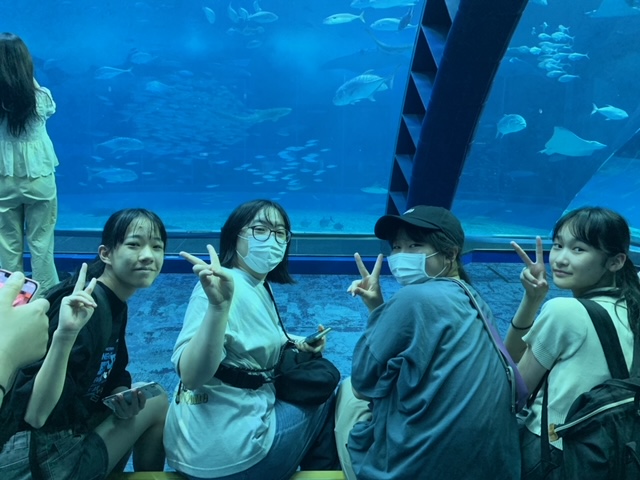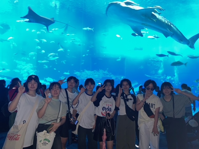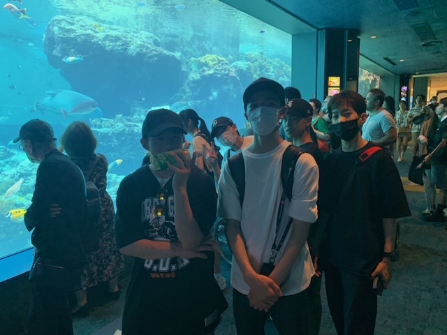 今日の最後の観光場所の美ら海水族館に来ました。魚やジンベエザメなどに癒されてます。