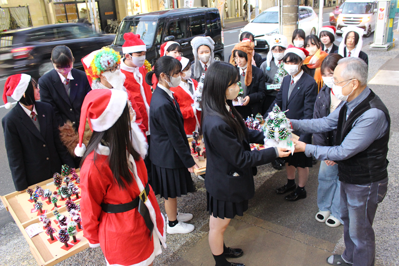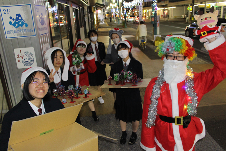 今年も部員達が地域の方々と笑顔で会話し、とても良い交流となりました。実際に活動を通し見て感じた幸せを忘れず、次年度以降も「静岡大成中高美術部の伝統」として続けていこうという優しい気持ちに繋げることができました。クリスマスまでに静岡市葵区の北街道商店街にお越しの際は店頭等に飾ってある「松ぼっくりミニツリー」をご覧いただき、少しでも笑顔になってもらえると部員一同嬉しく思います。