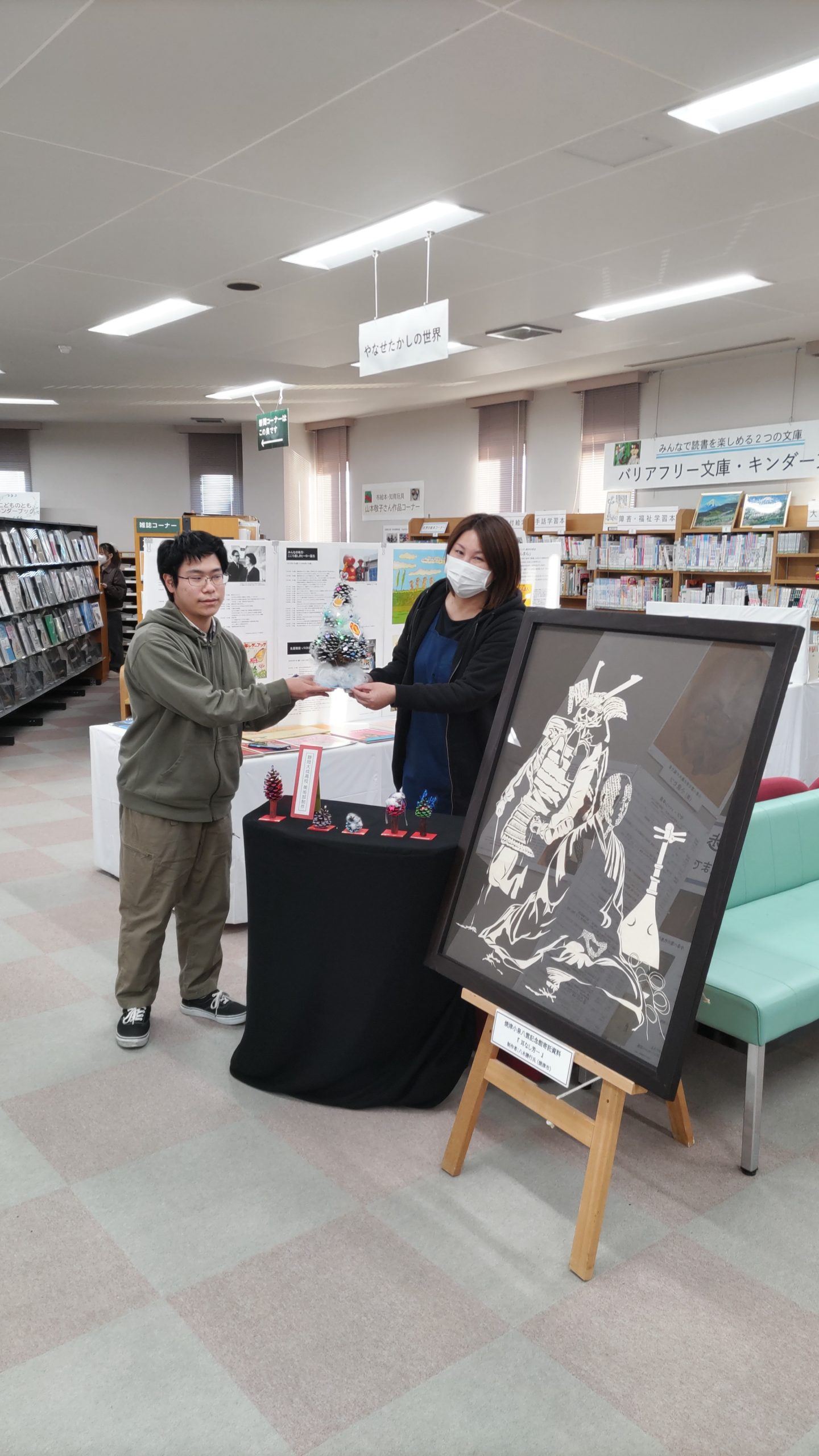 昨年に引き続き系列校の静岡福祉大学内にある図書館に大きめの松ぼっくりツリーとミニ松ぼっくりツリーをプレゼントさせていただき、今注目をされている小泉八雲の耳なし芳一の切り絵と共に館内の目立つ場所に展示もしていただきました。また今回も昨年に引き続き2年前に本校美術部を卒業した福岡宙樹さんが在学中の福祉大学へ届けてくれ、さらに図書館の村瀬さんと共に写真も撮っていただくことができました。今回届けてくれた福岡さんにも感謝をしつつ、今後も引き続き図書館とさまざまな活動を行なっていきたいと思います。そして最後に、本当に福祉大学の図書館の方々多にはいつも感謝をしております。ありがとうございます。