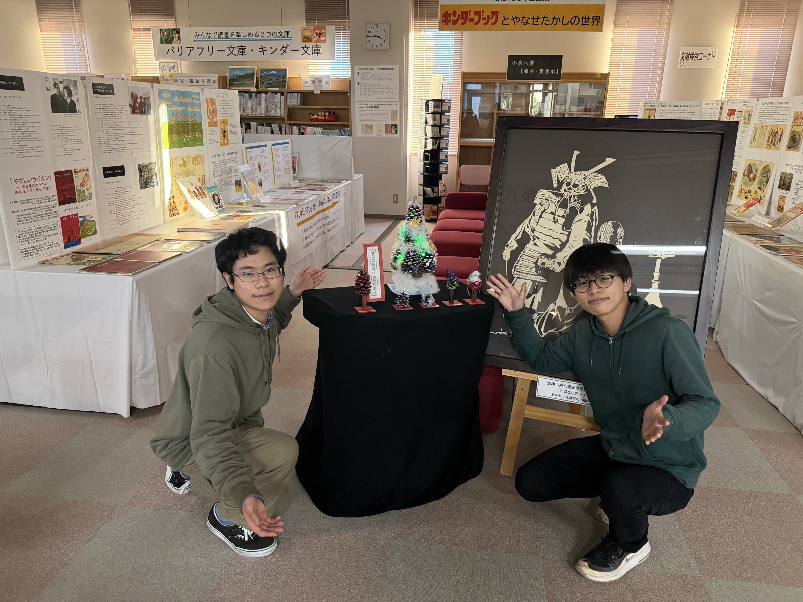 昨年に引き続き系列校の静岡福祉大学内にある図書館に大きめの松ぼっくりツリーとミニ松ぼっくりツリーをプレゼントさせていただき、今注目をされている小泉八雲の耳なし芳一の切り絵と共に館内の目立つ場所に展示もしていただきました。また今回も昨年に引き続き2年前に本校美術部を卒業した福岡宙樹さんが在学中の福祉大学へ届けてくれ、さらに図書館の村瀬さんと共に写真も撮っていただくことができました。今回届けてくれた福岡さんにも感謝をしつつ、今後も引き続き図書館とさまざまな活動を行なっていきたいと思います。そして最後に、本当に福祉大学の図書館の方々多にはいつも感謝をしております。ありがとうございます。
