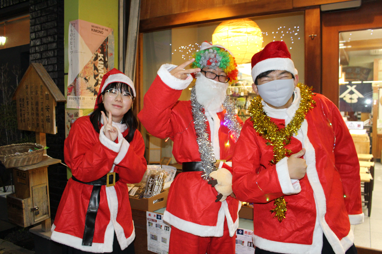 配付時はクリスマスの曲をかけ部員がサンタやトナカイに扮して電飾を身に付け、1時間ほどかけて寒い中でしたが部員も笑顔で1軒1軒にプレゼントをしてくれ、商店街の方々も毎年の恒例となっていることを覚えてくれている店舗も増え「毎年ありがとう」「今年も飾りがきれいだね」など、心温まる言葉をかけていただき、サンタやトナカイの格好も褒めていただきました。またプレゼントに伺うと感謝の言葉だけでなくお菓子やミカンなどを笑顔で逆にプレゼントをしてくださる店主の方もいて、今年も20年間地道にコツコツ頑張ってきたことが今に繋がっていると感じ部員全員で心を温めることができました。