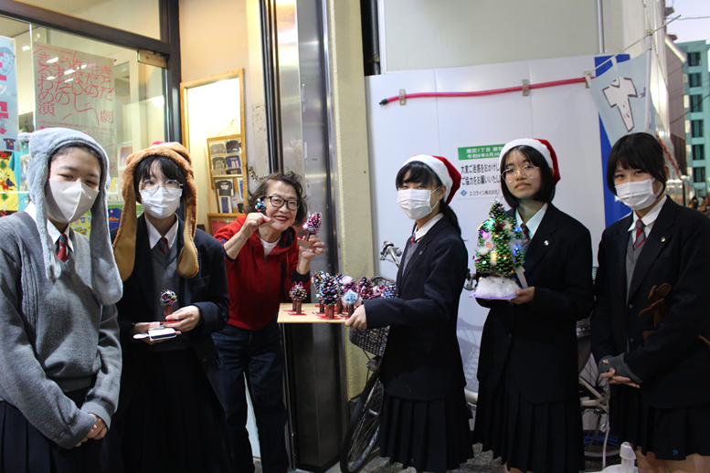 今年も部員達が地域の方々と笑顔で会話し、とても良い交流となりました。実際に活動を通し見て感じた幸せを忘れず、次年度以降も「静岡大成中高美術部の伝統」として続けていこうという優しい気持ちに繋げることができました。クリスマスまでに静岡市葵区の北街道商店街にお越しの際は店頭等に飾ってある「松ぼっくりミニツリー」をご覧いただき、少しでも笑顔になってもらえると部員一同嬉しく思います。