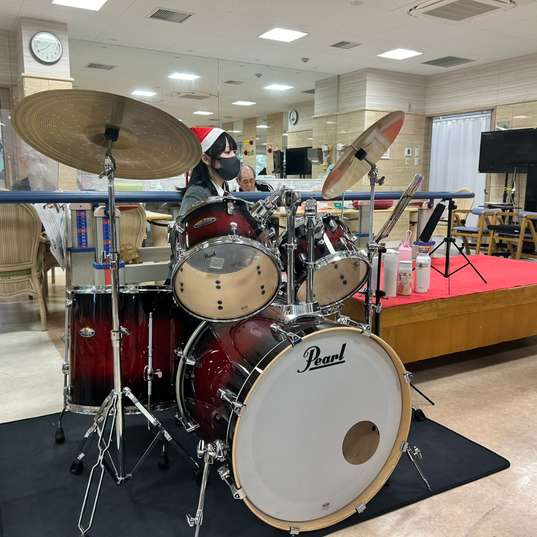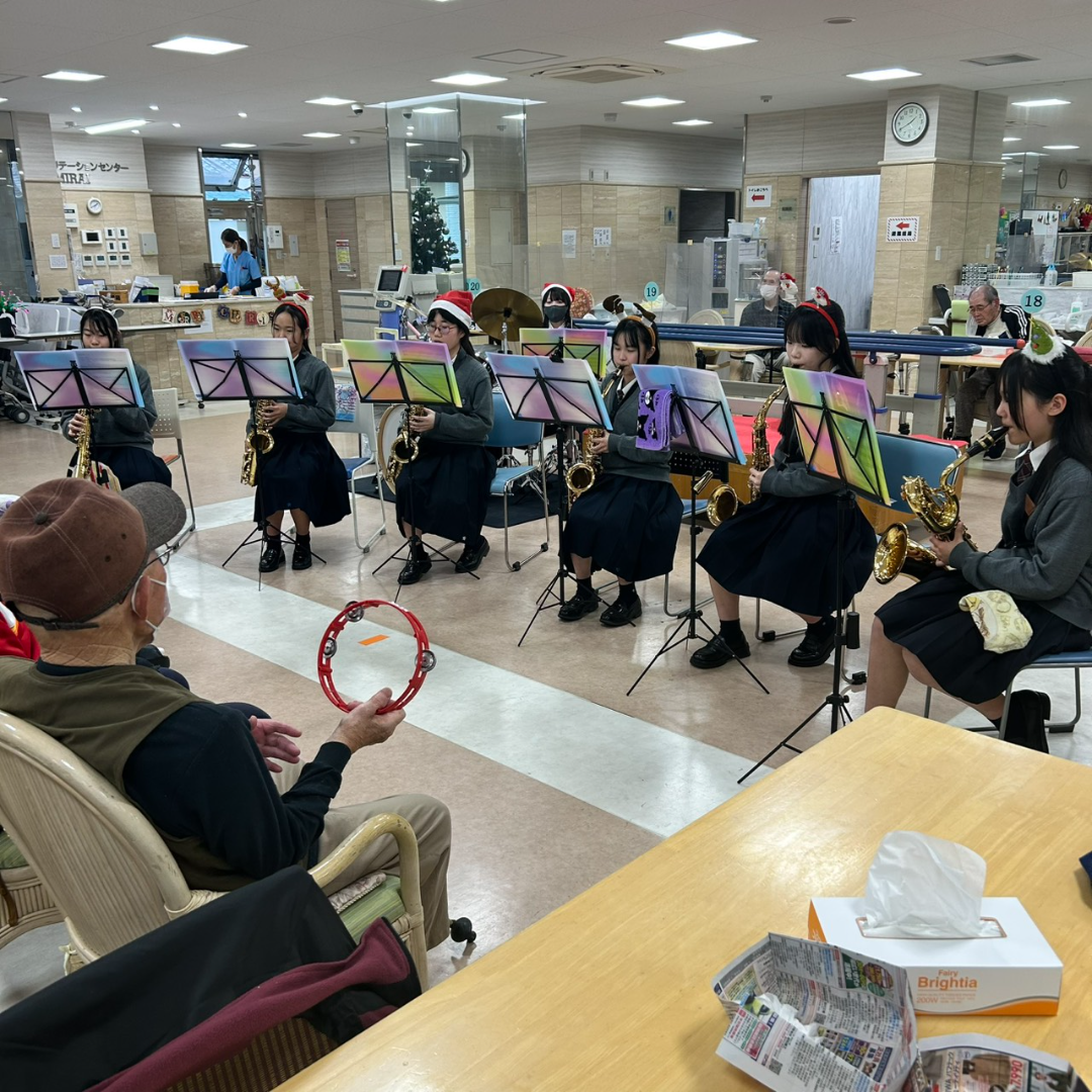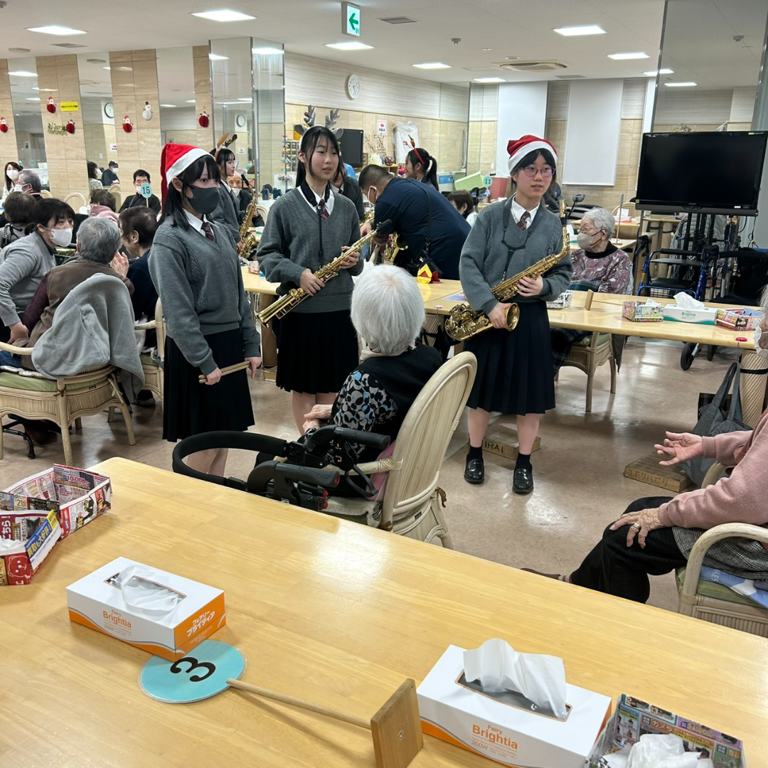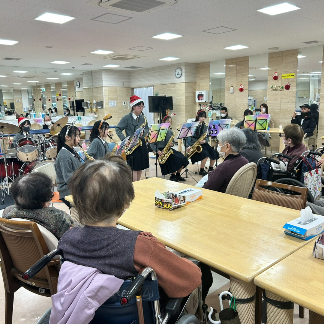 クリスマスが近かったため、「恋人たちのクリスマス」で演奏を始め、「ふじの山」「東京ブギウギ」「明日があるさ」など、利用者様に親しみのある曲を中心に、全8曲を演奏しました。曲の順番や選曲では、季節を感じてもらい、楽しんでいただけるように工夫しました。