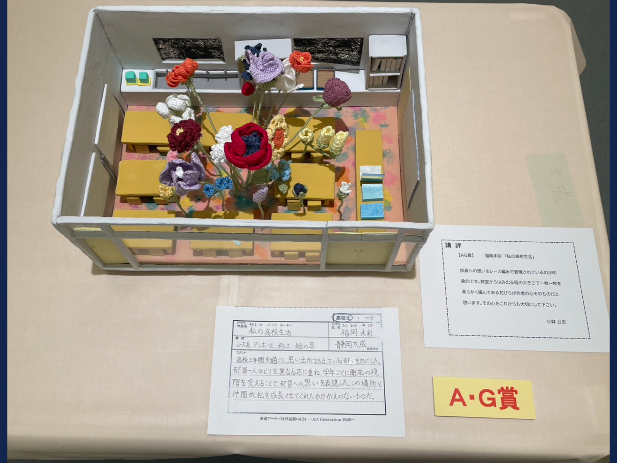 今回も多摩美術大学の赤松祐樹先生と美術家の小鉢公史先生をお招きし1点1点丁寧に審査がおこなわれ、本校美術部員7名の作品が入選し、さらにその中の高校3年生の福岡未彩さんが「AG賞」を受賞しました。今回の展覧会は富士市にある「ロゼシアター」に展示されております。この作品展は高校生だけなく一般の方々(18歳から35歳)も応募でき、毎年平面立体の様々なジャンルの作品が出品されている見ごたえある展覧会ですので、是非ご高覧ください。